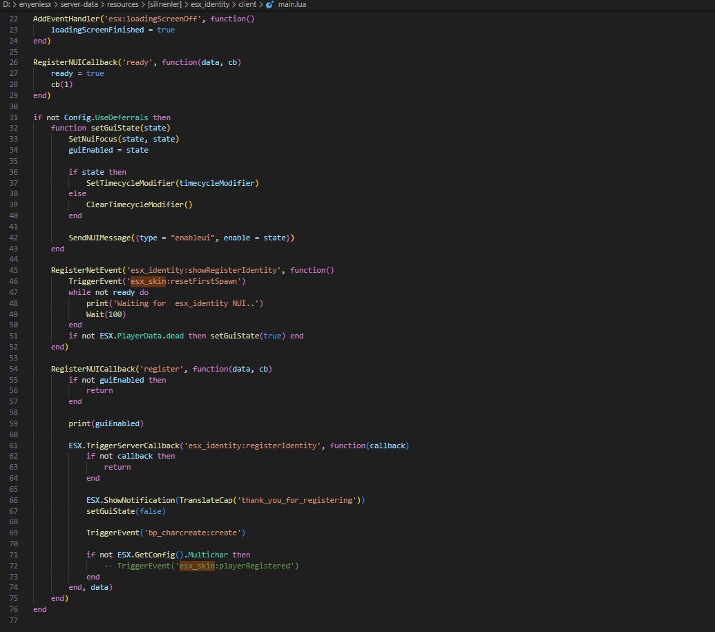 esx\_identity > main.lua RegisterNUICallback( find the ‘register’ part and add the charcreate event like this.