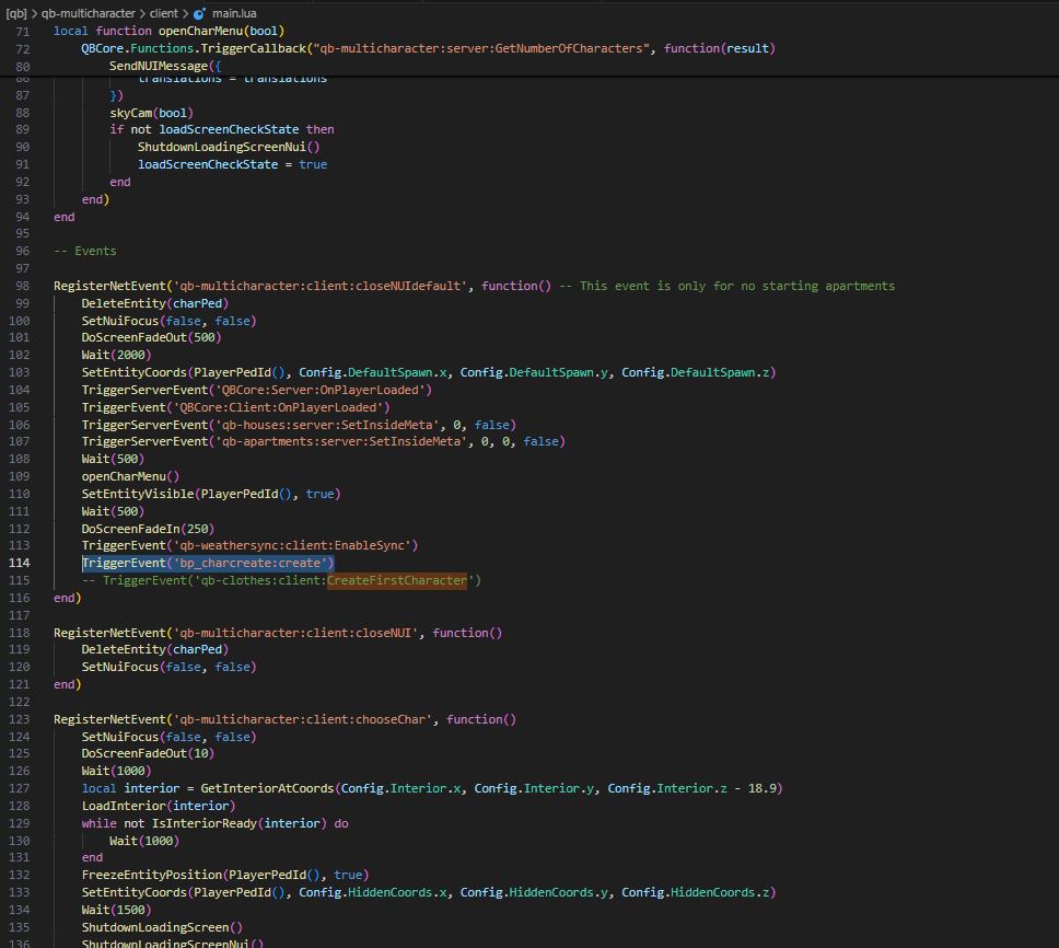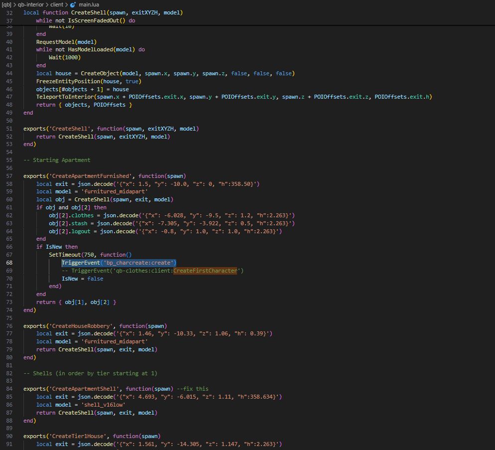 qb-interior > main.lua >CreateApartmentFurnished export . Here disable the qb-clothing event and put the bp\_charcreate event