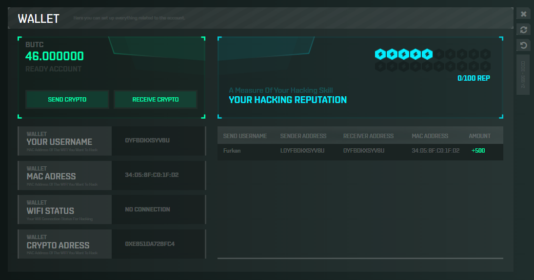 This app is central to managing digital currency in your in-game operations, allowing users to send and receive cryptocurrency securely while tracking their hacking activities and reputation progress.